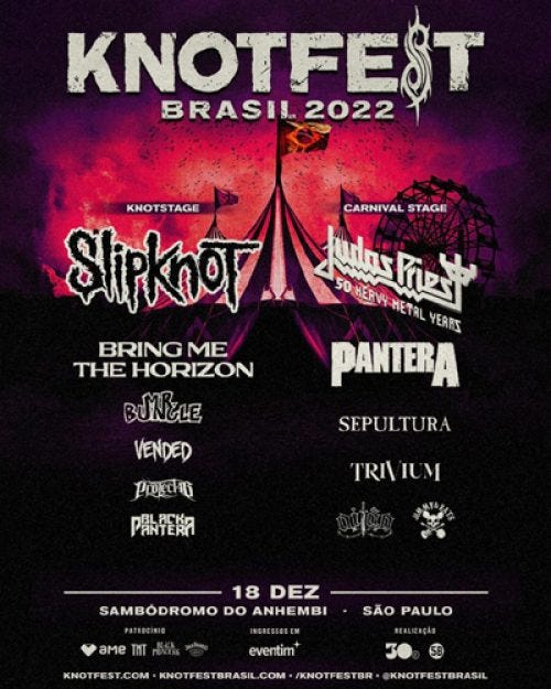 Esse mesmo otimismo se aplica ao Knotfest? Duas datas no Allianz Park não configuram expectativas moderadas, convenhamos. Não nos esqueçamos, o Rock in Rio anunciou Avenged Sevenfold como headliner de um dos seus dias e o Bring me the Horizon também montou um mini-fest, também pela 30e, para o mesmo estádio na zona oeste paulistana para não sairmos do espectro moderno da música pesada.